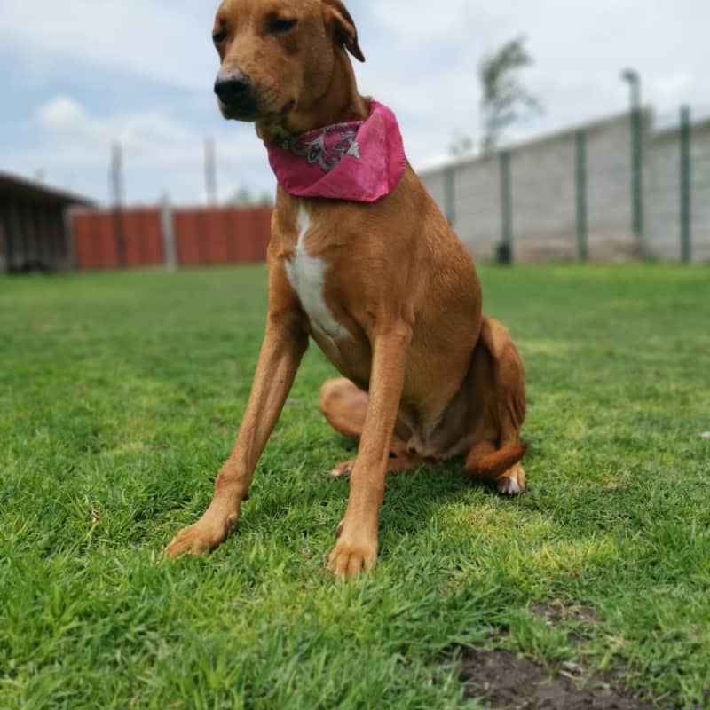 Esta cachorra fue encontrada junto con sus 5 hermanitas en un terreno baldío abajo de unas estructuras de cemento. Tenían un poco de miedo a los humanos pero después de ser rescatadas ya han aprendido a convivir con las personas y buscan la compañía de sus hermanitas y de los humanos. Son juguetonas y les gustan mucho las caricias.
